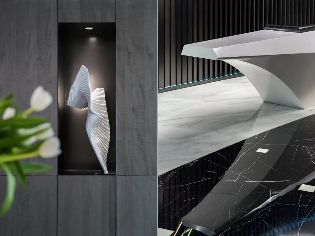 艺术是空间的底色,艺术作品应当具有人文关怀和文化启蒙。设计师根据行业属性及企业文化创作的雕塑作品“源”,通过一层层的亚克力、形似煤炭的石子,叠加构成树的姿态,形成虚实的变化,也成为吸引人驻留的一隅清净处。