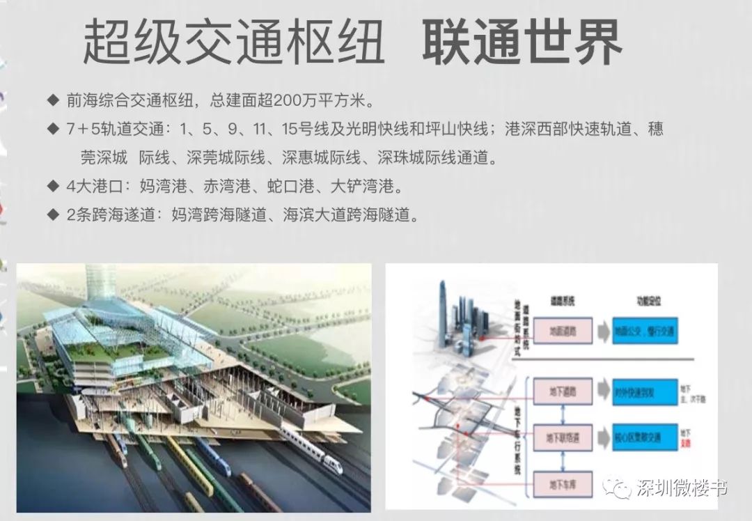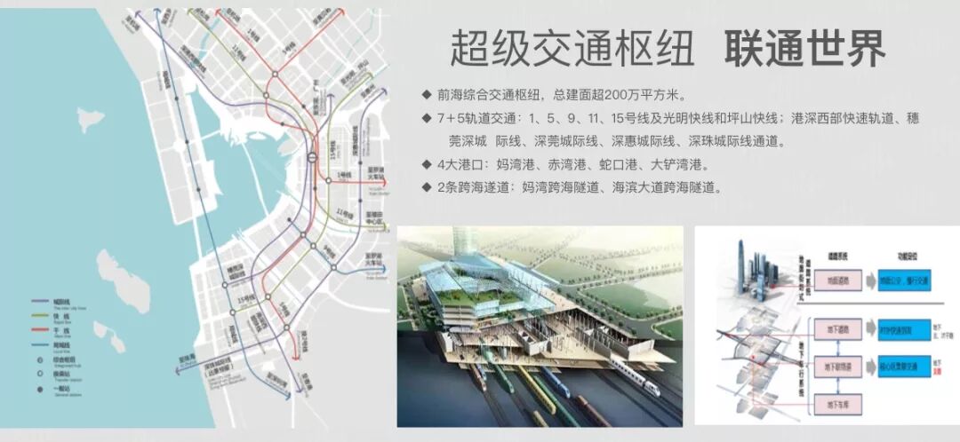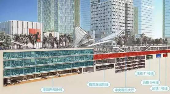 ?多维度复合交通:地下空间共有6层,从地下5、6层深圳最大车库依次向上,地下4层城际轨道线可以让你15分钟抵达香港,25分内港深机场互通。交通换乘区依次向上,公交和出租车系统则位于地面;地下3层3条城市轨道线,让未来前海轨道网密度达到每平方公里3.5公里,将成全球地铁密度最高城区之一,领先国际;地下1、2层是商业区,这里人流聚集,四通八达,上下皆可。