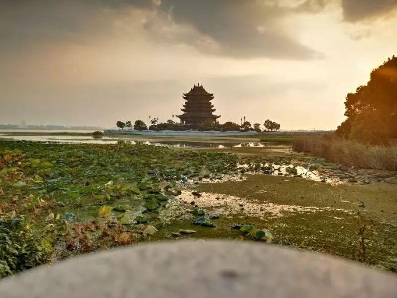 秋日荷花田田,遥望重元寺壮阔。