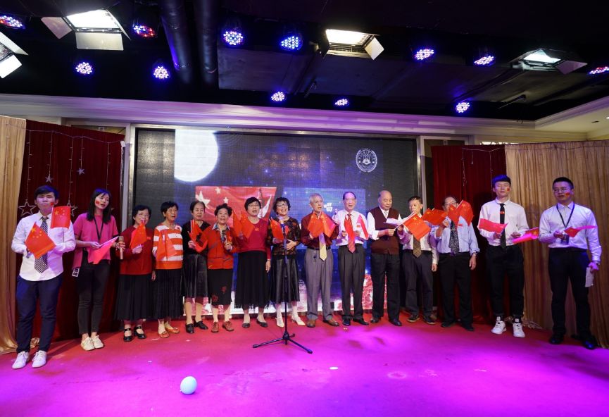 随后,校友们又献上一首即兴歌曲《我的中国心》,在领唱老校友浑厚的嗓音中,歌曲饱含着对祖国母亲的深情。全场校友被这样的气氛牵引着,新老校友们共同挥舞国旗的画面触动在场每个人的心弦。
