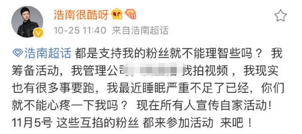 今天浩南发文希望南家人理智一点, 我筹备活动管理公司,又直播又拍段子 ,我现实也有很多事要跑,我最近睡眠严重不足了已经,你们就不能心疼一下我吗?现在所有人宣传自家活动!11月5号 这些互掐的粉丝都来参加活动 来吧 !