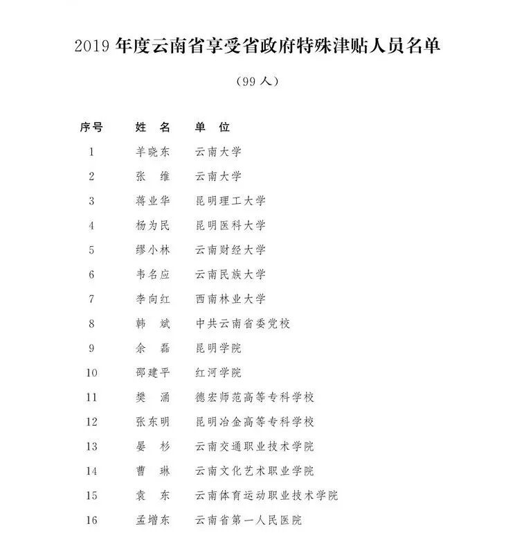 2019年度云南省享受省政府特殊津贴人员