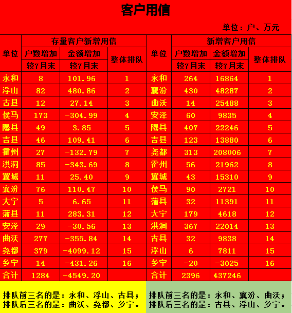 重要业务指标“龙虎榜”