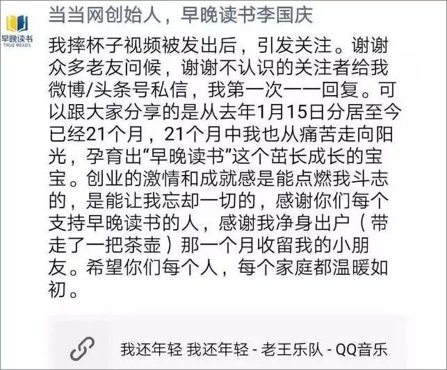 这个“也”字立马被网友揪住,嘲笑说:“也是什么意思,承认俞渝的指控咯?” 随后李国庆把“也”字删掉。 目前李国庆称已提出离婚,请大家等法院判决。 清官难断家务事,李国庆俞渝夫妻的家务事,孰是孰非,谁真谁假,外人不好评判。但是很赞同一个网友的评论: “一别两宽,各生欢喜,多好。毕竟还有个共同的娃。” 夫妻吵得死去活来,不管谁输谁赢,都输了孩子。