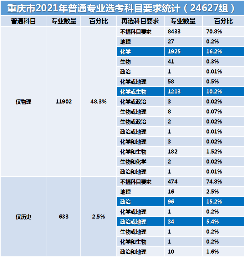 首选“物理”的专业占48.3%,首选“历史”的专业仅占2.5%,首选“历史或物理”则占49.1%。一眼看去,似乎选物理更占优势。但是,需要注意的是,首选历史或物理,即对首选科目不作要求的专业占了49.1%。