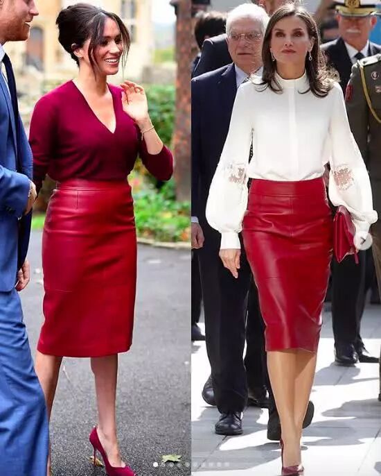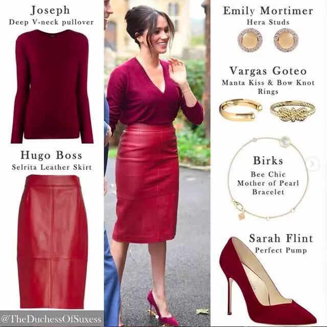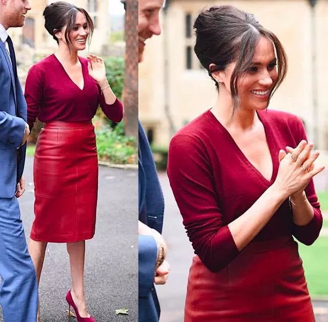 星期五早上,梅根穿着完全相同的裙子与哈里王子(PrinceHarry)一起参加女王信托基金组织会议。梅根穿着约瑟夫(Joseph)的深红色V领毛衣,就搭配着这件皮质铅笔裙,脚踩莎拉·弗林特(SarahFlint)定制红色高跟鞋,用同色原则,打扮出职场女性的气息。