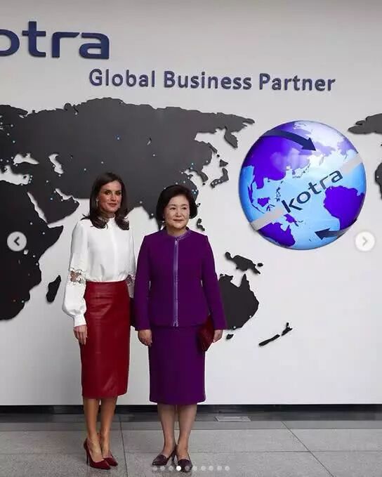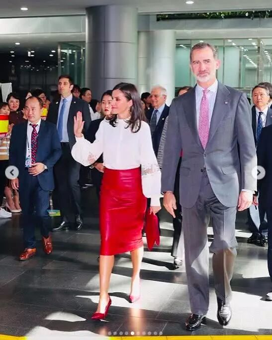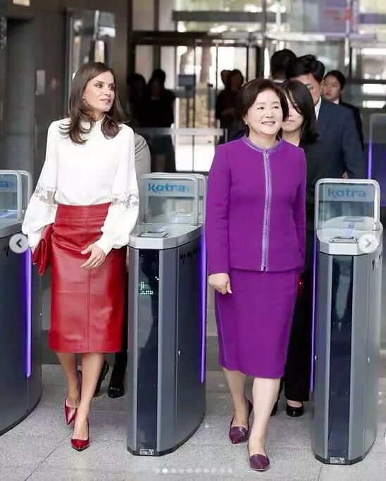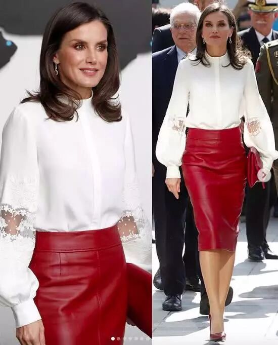 这条红色皮裙名为“Selrita”裙,595美元(约4200人民币),莱后周四出访韩国时就穿着,配了一件白色的大袖衬衫,在那里和西班牙国王一起接受了“首尔荣誉市民”的颁奖。