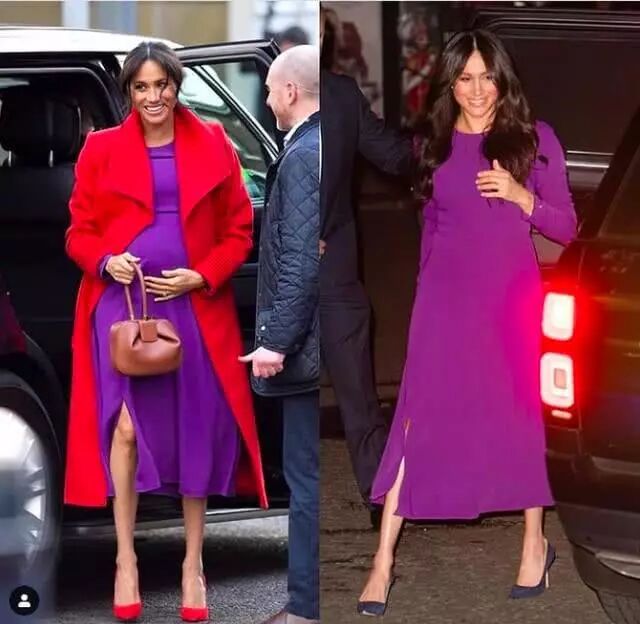 今年(2019)一月中,梅根当时怀孕快七个月,挺著孕肚穿上这件Aritzia宽松剪裁的洋装再适合不过,当时她搭配了红色大衣,虽然颜色上的撞色冲突引起两极的评价,但对孕妇来说已算摩登。