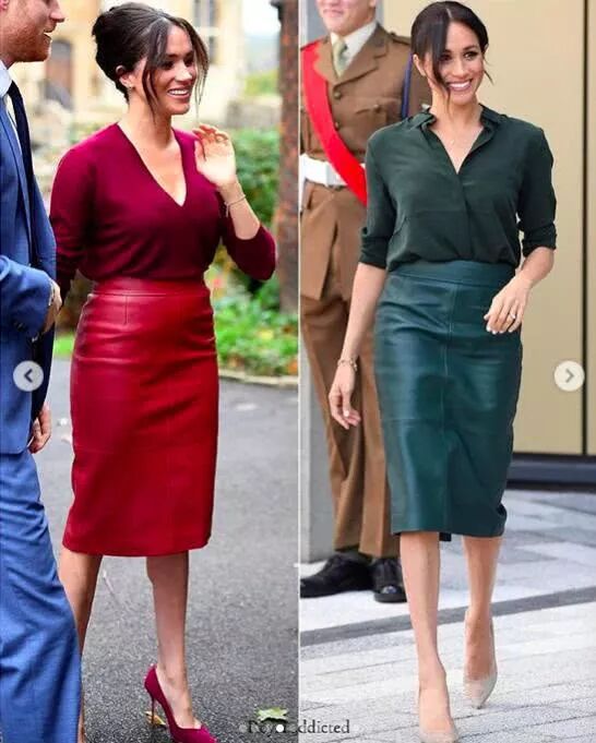 梅根也是相当喜欢皮质铅笔裙加衬衫的搭配,2018年10月,她也选择了墨绿色的同色搭配,脚上的高跟鞋则是奶油色系的。