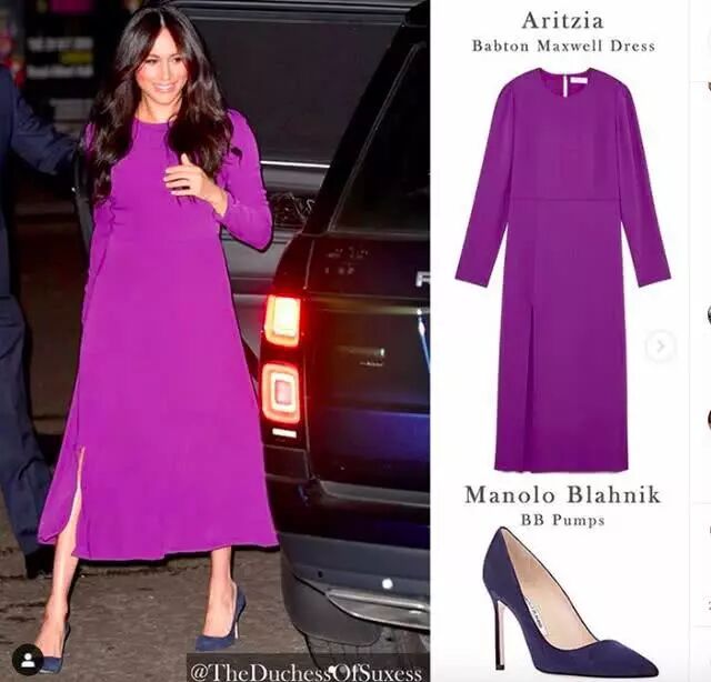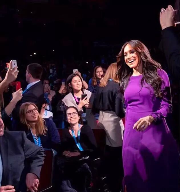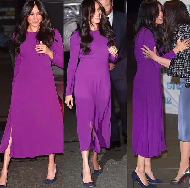 这次将头发束起,虽然V领毛衣塞进皮质裙中还是有些显臃肿,但是梅根已经比之前的状态好很多,她前一天独自代表王室参加世界青年高峰会(OneYoungWorld)在伦敦的开幕式,没有哈里王子的陪同,她独自一人进场,穿着超显眼的茄子紫色洋装,网友们似乎不怎麽埋单。虽然这条加拿大设计师品牌Aritzia的紫色洋装,又是梅根重复穿过的单品。