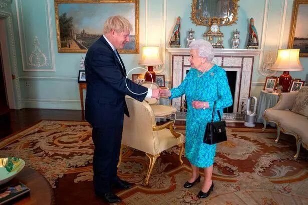 ▲在今年7月女王与新当选英国首相的鲍里斯·约翰逊会面时,人们看到了摆放在女王身后小桌子上的哈里梅根夫妇的订婚照,然而最新流出的图片中,这张订婚照却“消失”了。