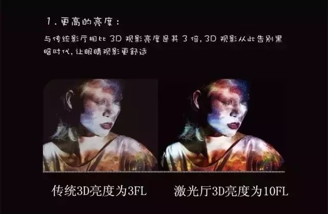 亮度更高: 与传统的影厅相比,亮度提升3倍,光影从此告别黑暗时代!让观影更舒适!