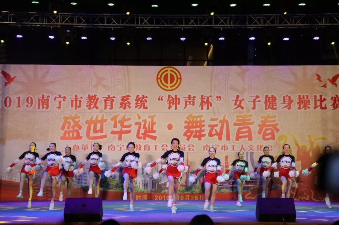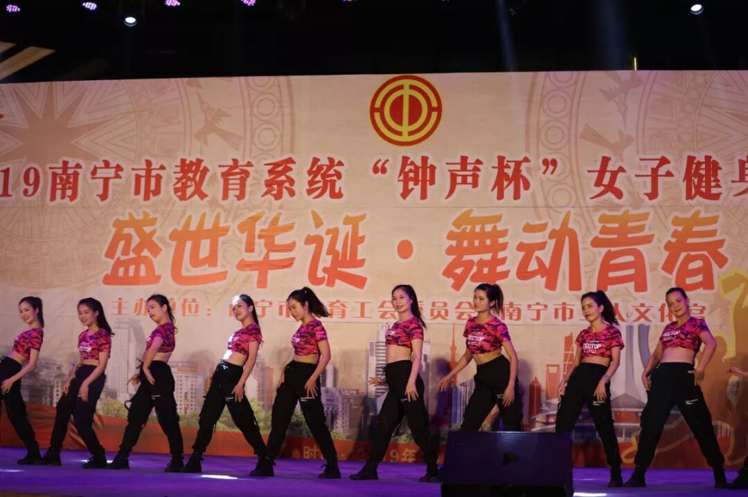 为深入学习贯彻习近平总书记系列重要讲话精神和治国理政新理念新思想新战略,学习领会习近平新时代中国特色社会主义思想的丰富内涵,隆重庆祝建国70周年以及我国第35个教师节,充分展现我市广大教职工的精神风貌、凝心聚力,2019年10月25日晚,由南宁市工人文化宫、南宁市教育工会委员会举办的2019庆国庆“钟声杯”女子健身操比赛在工人文化宫职工广场激情开跳。