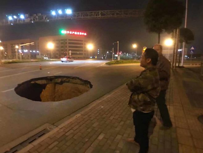 当天凌晨记者赶到现场,看到靠近人行道旁非机动车道与机动车道之间路面出现一个椭圆形大坑。塌陷口宽约4米左右,深不见底,可以听到很响的水流声。塌陷坑壁有污水井,塌陷周围有裂缝。