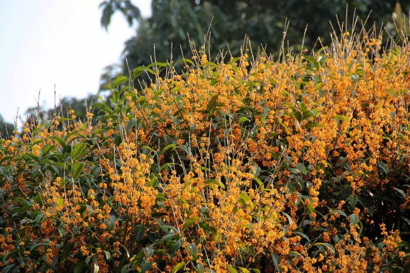漫步桂林,在景区、公园、途径、庭院、江畔、湖滨随处可见桂花的芳踪。一株株、一行行、一片片,锦绣山城掩映在蓊郁的桂花丛中。