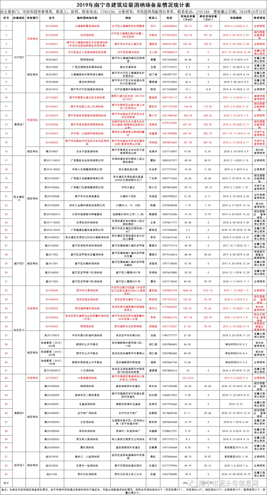 【消纳场备案统计表信息】南宁市建筑垃圾消纳场备案情况统计表(2019.10.25)
