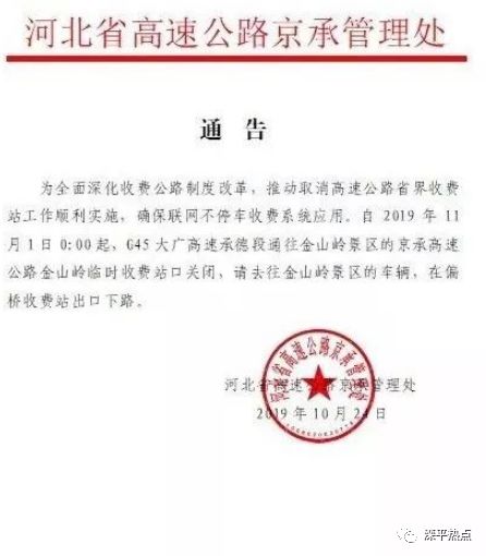 为全面深化收费公路制度改革,推动取消高速公路省界收费站工作顺利实施,确保互联网不停车收费系统应用。自2019年11月1日0:00起,G45大广高速承德段通往金山岭景区的京承高速公路金山岭临时收费站口关闭,请去往金山岭景区的车辆,在偏桥收费站出口下路。