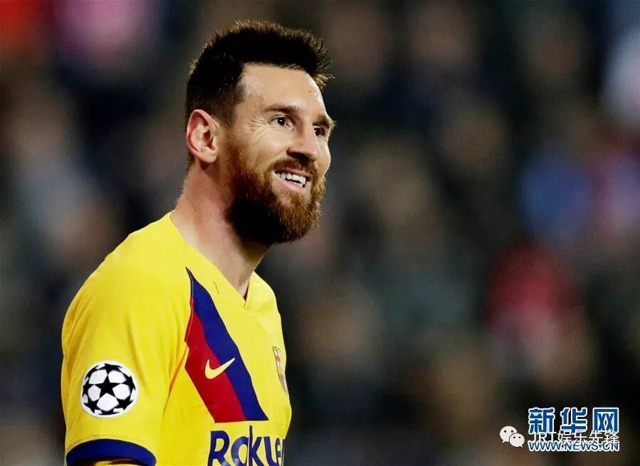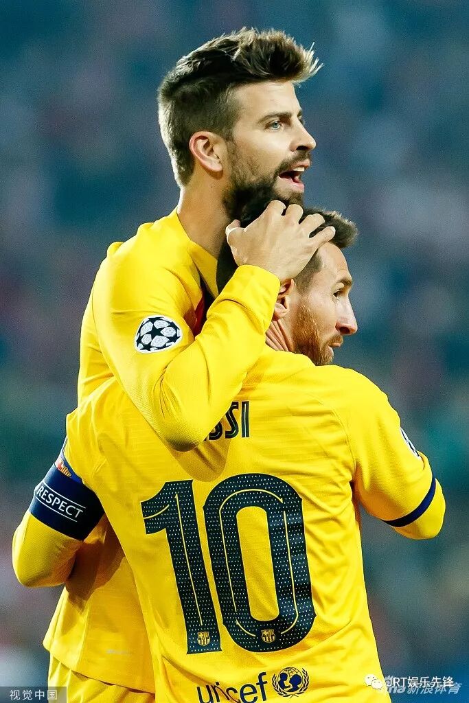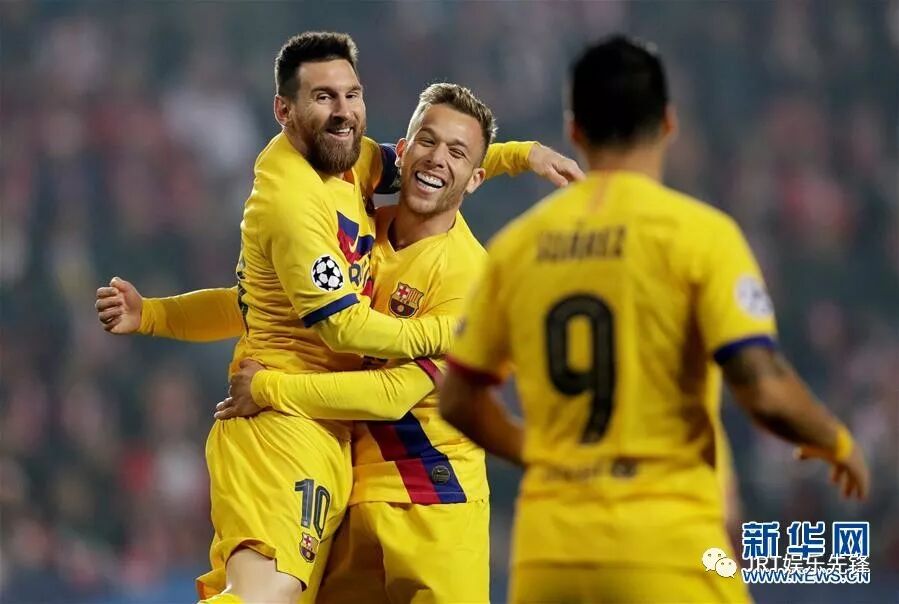 巴塞罗那队球员梅西(左)在进球后和队友阿图尔庆祝。当日,在2019-2020赛季欧洲足球冠军联赛F组比赛中,西班牙巴塞罗那队客场以2比1战胜捷克布拉格斯拉维亚队。