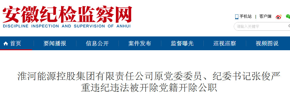 日前,经中共安徽省委批准,安徽省纪委监委对淮河能源控股集团有限责任公司原党委委员、纪委书记张俊严重违纪违法问题进行了纪律审查和监察调查。