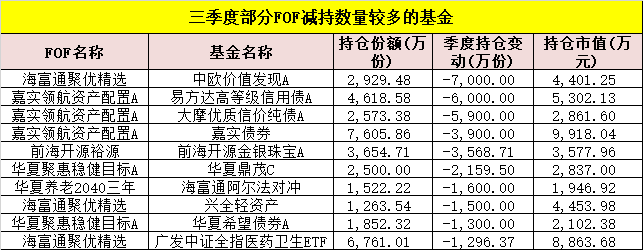 也有一些基金被单只FOF减持较多,比如海富通聚优精选减持了中欧价值发现A的份额达7000万份,最新持仓份额为2929.48万份;该FOF还减持了兴全轻资产、广发中证全指医药卫生ETF等基金。