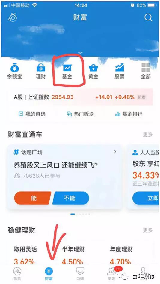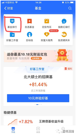 除了用证券交易软件购买基金,还有一种方式也可以,就是用支付宝申购基金,打开支付宝→【财富】页面,选择【基金】→【基金排行】→【近三年】