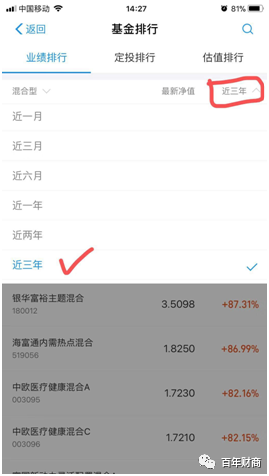 那支付宝上应该买什么基金呢?就买三年内排行第一第二的两只基金,你可能会想,他都已经涨了一倍了,未来的上涨空间是不是不大了,我能买涨幅小一点的吗?