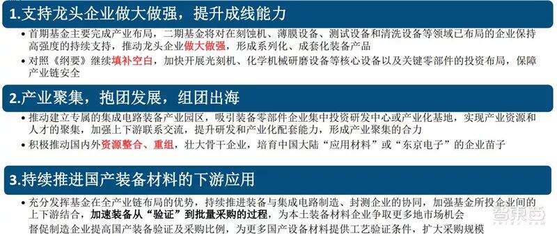 2、打造一个集成电路产业链供应体系,每个环节要与用户有机地结合起来,尤其是国产装备、材料等上游产业链环节。结合上述一期资金的投向总结来看,大基金二期可能重点向上游设备和材料领域倾斜。