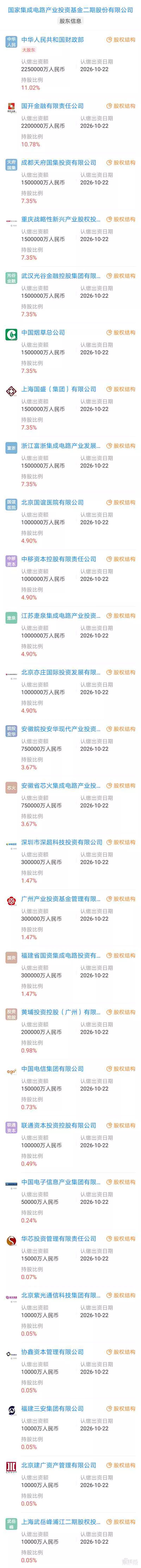 附国家大基金二期共27位股东名单:
