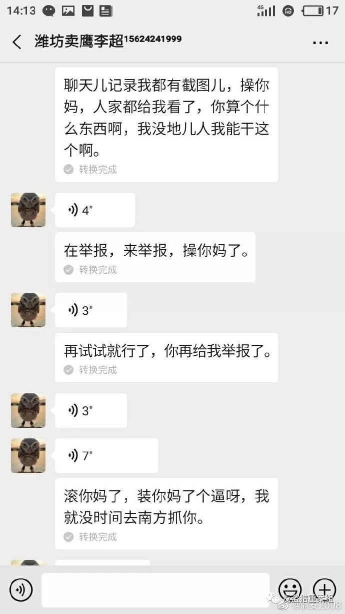 2019年10月26日,志愿者通过电话再次举报该猛禽贩子,但没过多久贩子便发来了威胁信息。大致内容如下(语音转换文字有偏差):