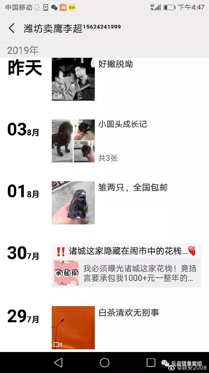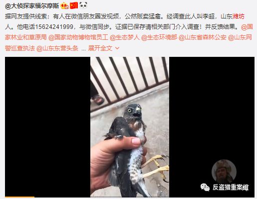 2019年8月2日,新浪博主 @大侦探家福尔摩斯 曝出这样一条线索:山东诸城有人长期贩卖猛禽。