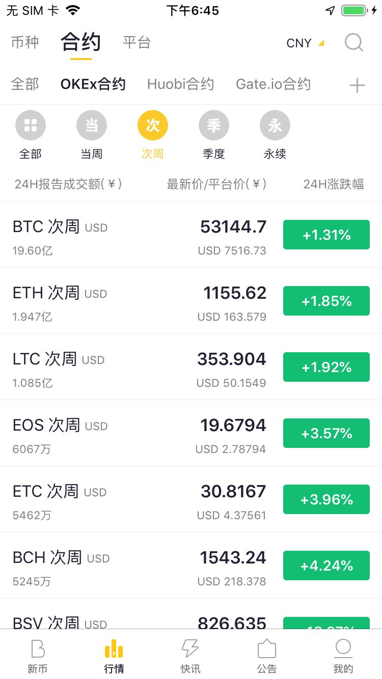 【合约】页面,优化合约交易所列表的显示。新增“全部 | 当周 | 次周 | 季度 | 永续”分类,可根据合约周期来筛选合约交易对,让查找更高效。与此同时,我们也优化了合约币种列表的交易对的显示方式,将原来以币种名称显示交易对的方式更改为以交易所名称显示合约交易对,提高可读性。