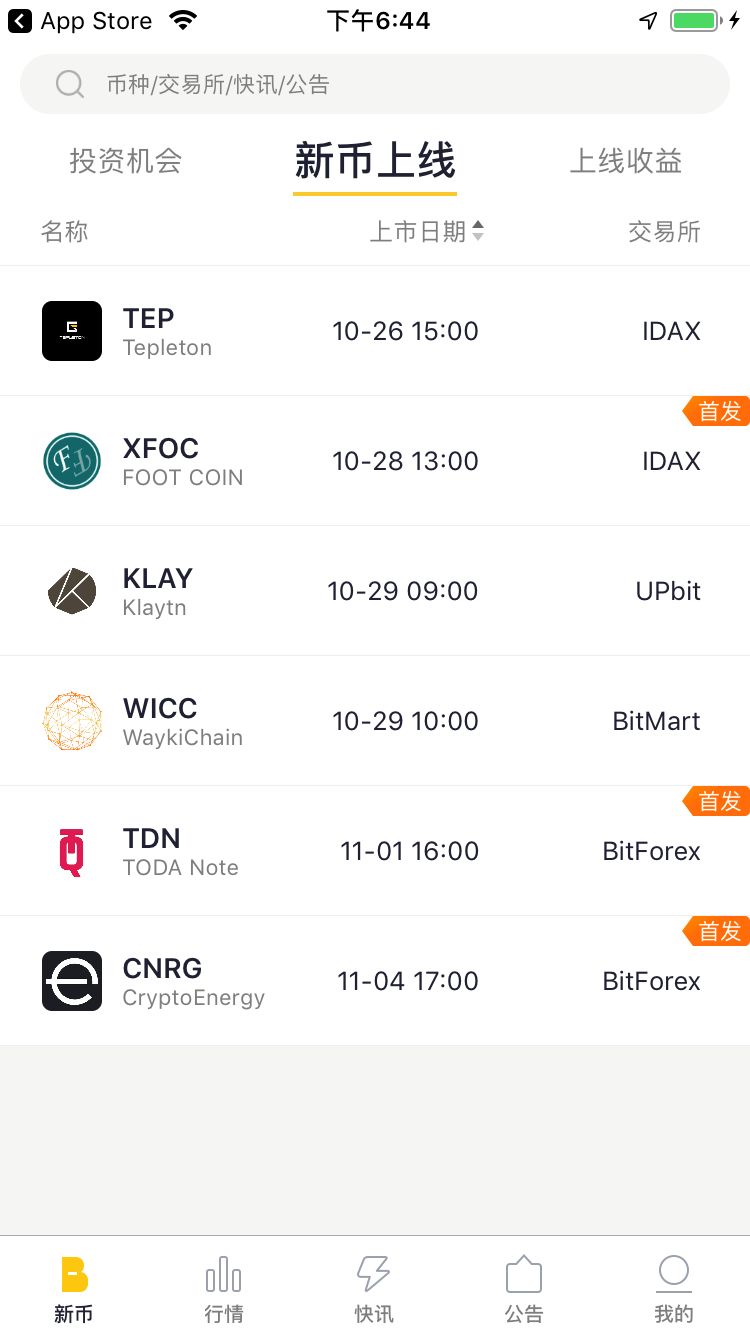 【新币】页面(1)新增“投资机会”列表。用列表的方式来显示近期的IEO项目、投票上币活动、打折售卖项目等投资机会,同时还支持一键分享,以长图的方式将投资机会分享到朋友圈、QQ、微博。