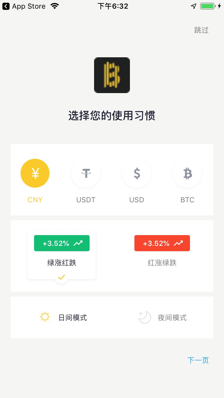 增加【引导】页面,在首次安装启动App的时候会出现该页面。在此页面上可以提前设置你习惯使用的汇率单位、涨跌颜色和白天/黑夜模式,还可以快速将自己感兴趣的币种添加进自选列表。