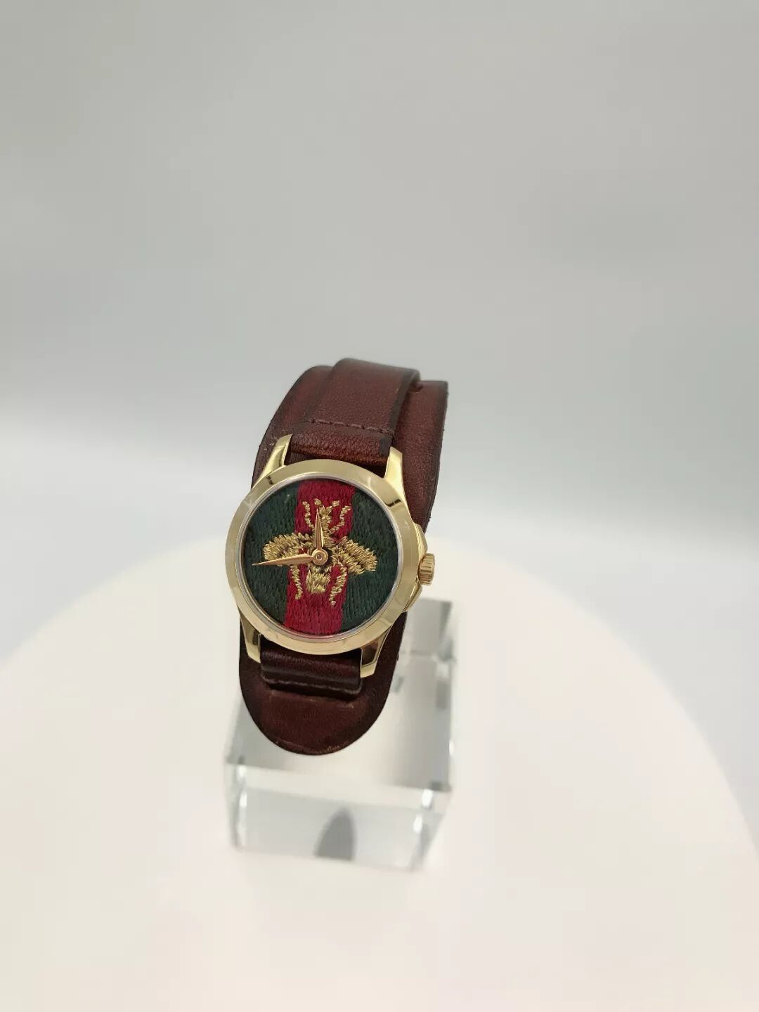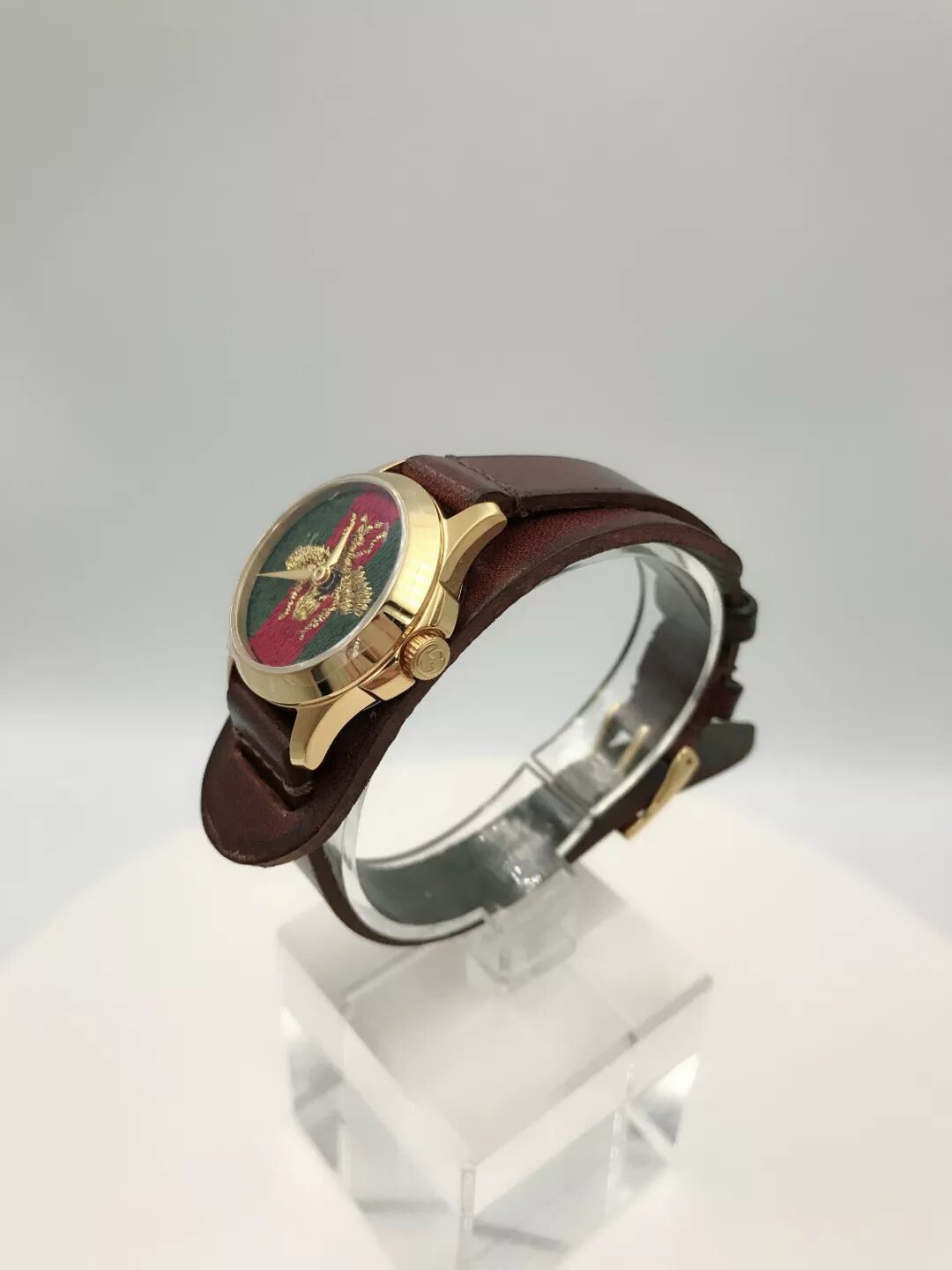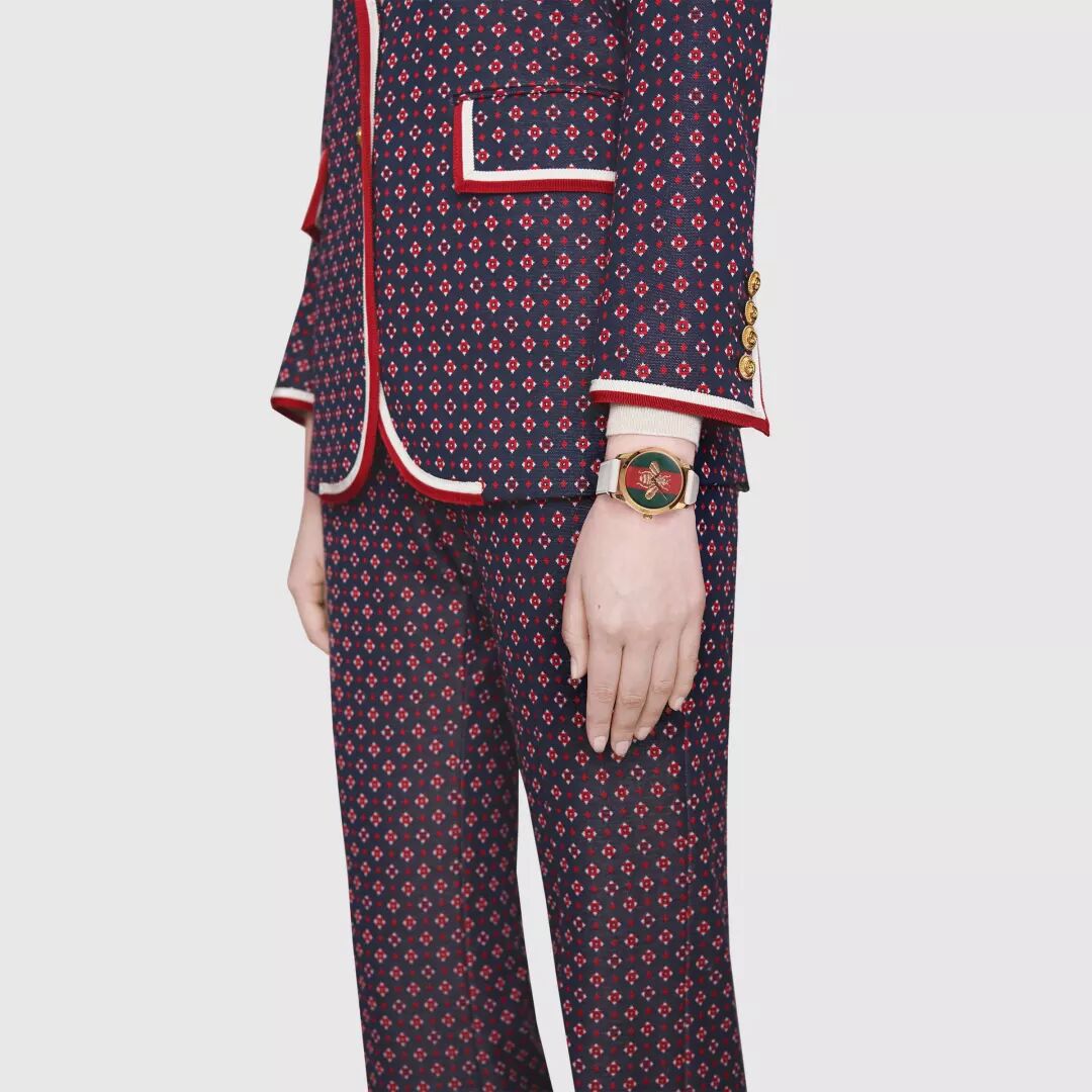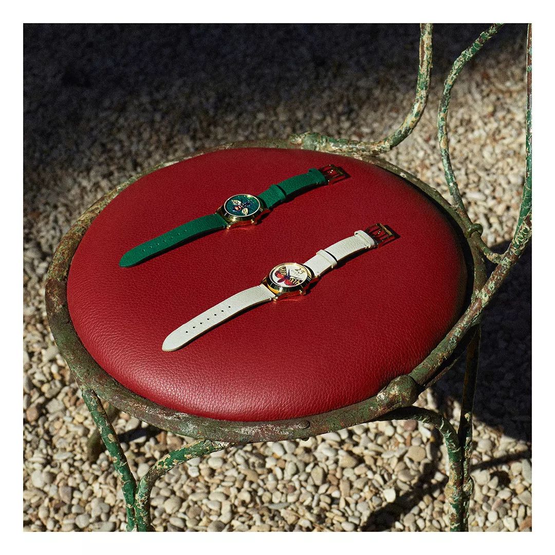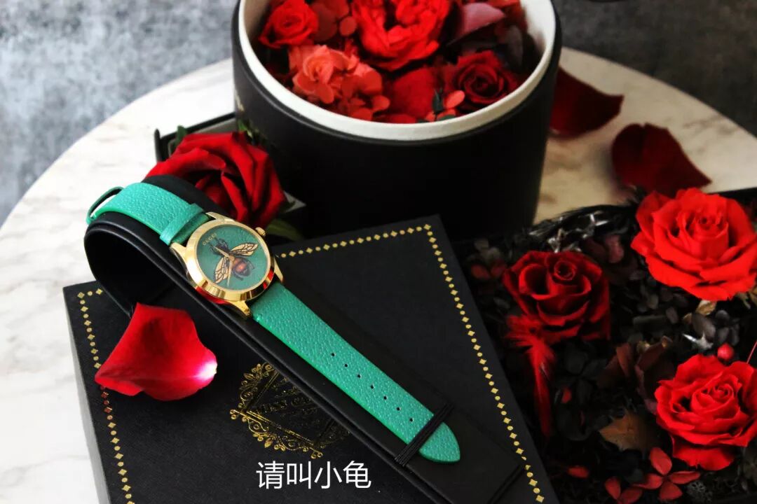翠绿色皮革表面,表面配有栩栩如生的蜜蜂图案,与黄金剑形指针、Gucci标识相得益彰。