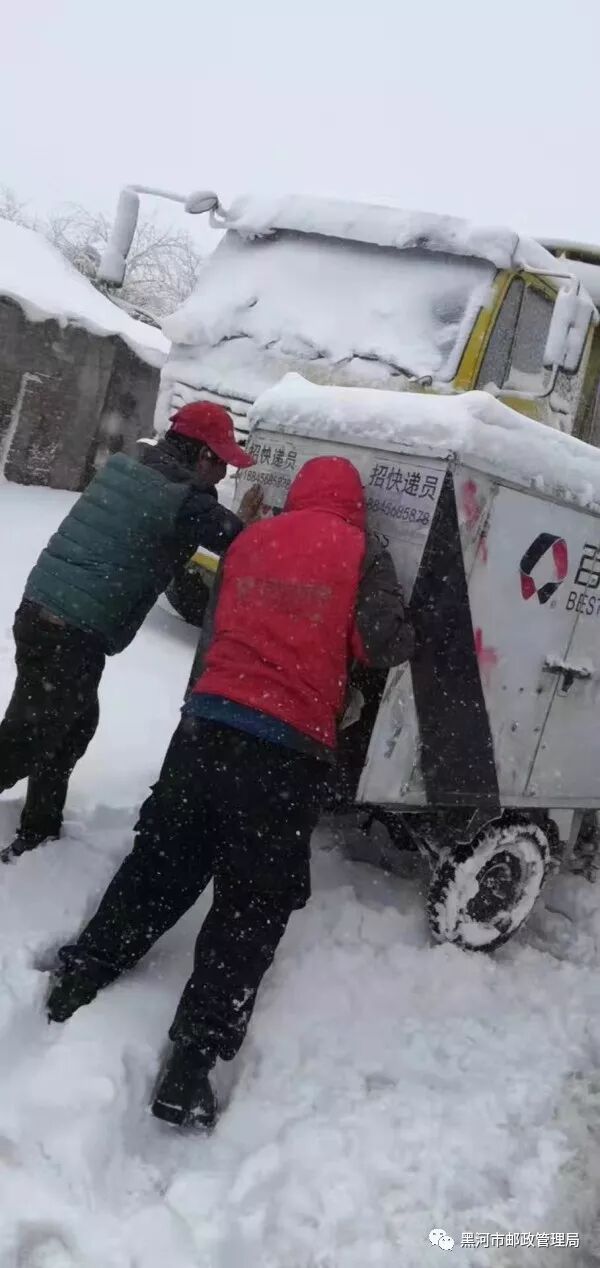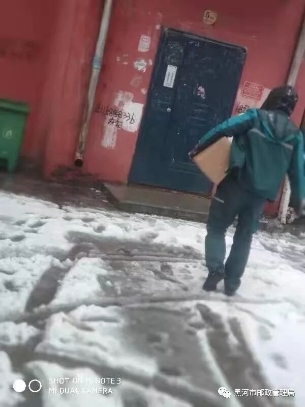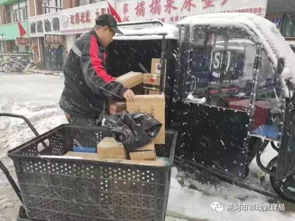 近日,黑河市全市范围内出现较大雨雪和降温天气过程,其中嫩江和黑河市区范围内降雪最高达16厘米。降温+降雪,道路结冰,路面湿滑,我们的快递小哥坚守在风雪中,您的快递在路上。