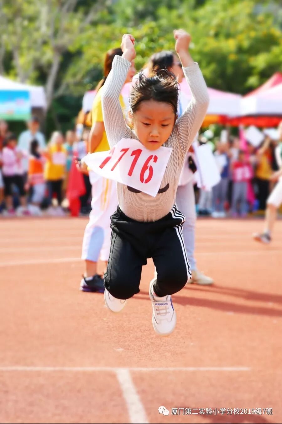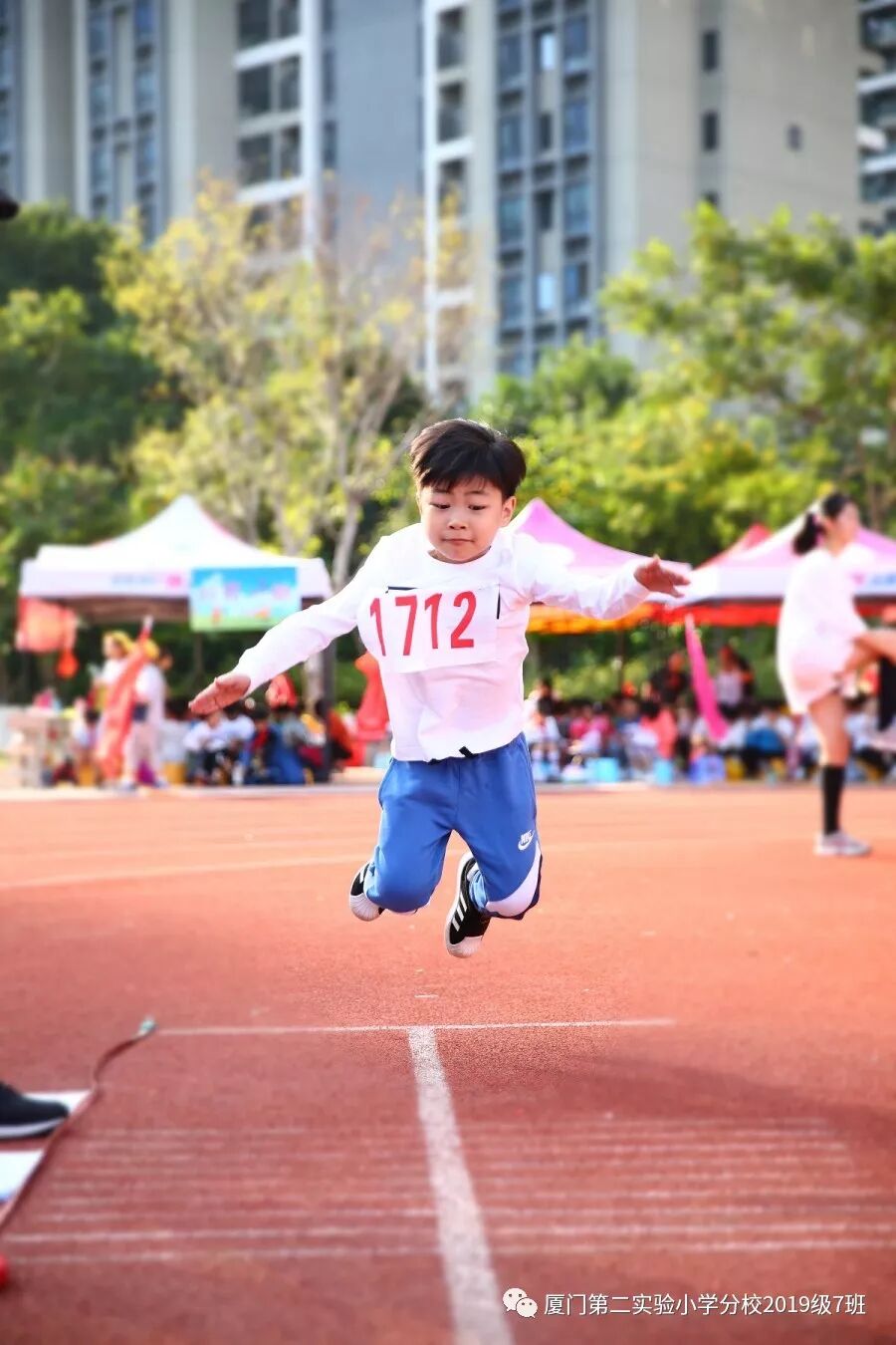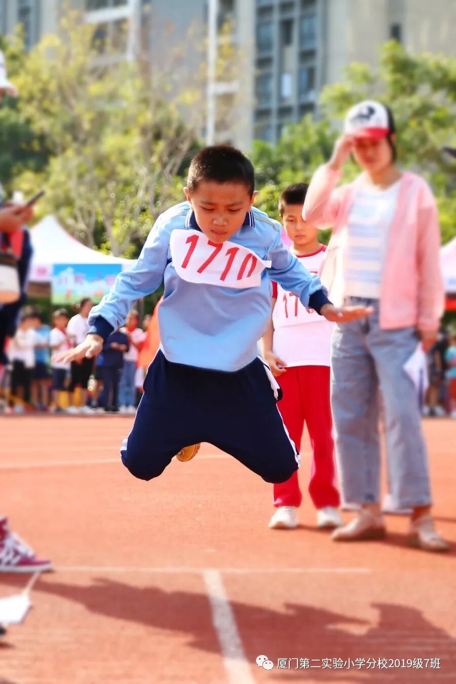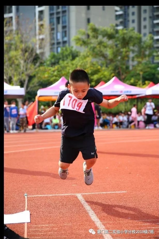 比赛终于开始了,只见小运动员们做好了准备姿势,甩手臂,踮脚尖,屏气凝神,发力腾空向前跃起。
