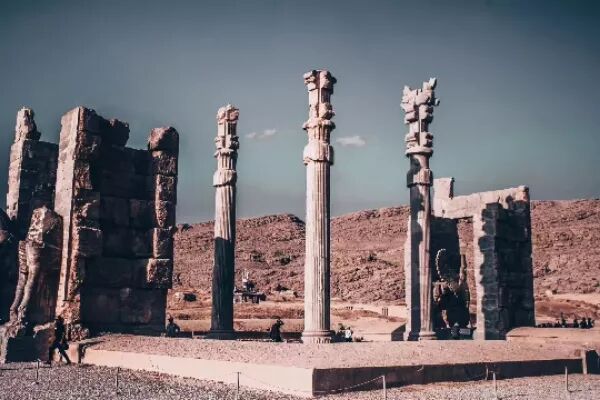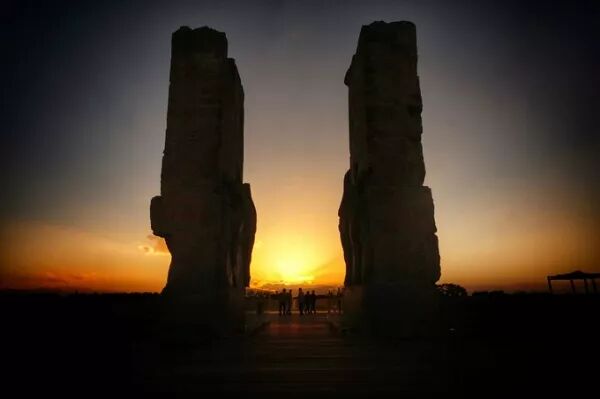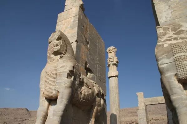 万国门 在其西北端入口处,人们从111级的台阶走上去,随后便能看到宫殿的正门——万国门。而在它的两边,则分别是波斯的皇帝,用来接见群臣和外国使节的阿帕达纳宫,以及由第四代波斯王薛西斯建造的百柱厅。