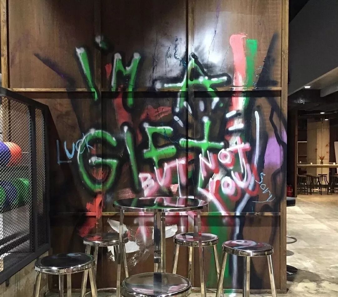 而Graffiti是指在墙壁上乱涂乱写出的图像或画作,城市涂鸦代表的纽约布朗克斯区(BronxZone)这是纽约最穷的街区居住在这个区域的年轻人喜欢在布朗克斯的墙面上胡乱图画各自帮派的符号以占据地盘。一些非帮派画家认为在墙上作画是很好玩的创意,于是撇开了帮派意识,逐渐形成了城市涂鸦这门艺术。涂鸦作为其中一种艺术形式传遍了世界各地。