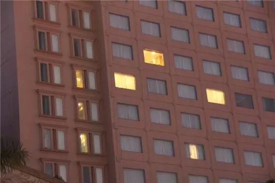 酒店超过400间豪华客房,只有几间客房零星亮着灯光。