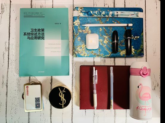 @Sugar_科研不秃头:基本每天都会背双肩包,容量大还解放双手。每天会带各种笔记本,上课要好好记笔记呀,还有各种各样的笔,满足记笔记和看文献的不同需求。U盘少不了,总会有用到的地方。Kindle有时也会带,一开始是为了看小说,现在装满了文献,我科研我快乐。吸油纸和口红必备啊,每天早起晚归,要做精致的理科女!还有从小就养成了出门就带水杯的习惯,记得多喝热水哈哈哈。