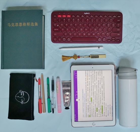 @他希冀天国的锦缎:上课的时候会背大容量的tote包,因为要带iPad和蓝牙键盘(上课做笔记的时候用onenote特别爽),同时还搭配了apple pencil。因为最近在上“马克思主义原著导读”这门课,所以有时候会带着马恩选集出门(真的hin重)。还会带着学院发的U盘,这样打印材料比较方便。左下角是一堆笔,很奇怪,没有带本子出门,却带了一堆笔(笑)。再加上个护手霜,学累的时候可以涂个护手霜开心一下~