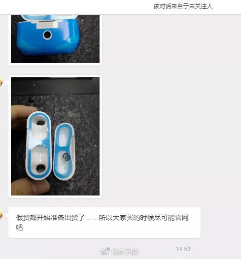 爆料的“耳机盒”不过需要注意的是,这两张照片其实是来自国内的微博用户。实际也并非是 AirPods Pro 的无线充电盒,而是假冒的山寨 AirPods Pro 产品。山寨厂家的操作我服了,苹果官方还没上市呢,仿品就已经要铺货了。