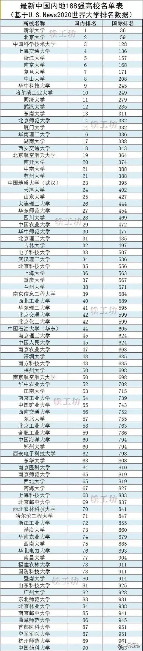 (U.S.News2019全球最佳大学排名有1250所院校入榜)。这1500所高校中有188所来自中国内地。笔者根据U.S.News2020世界大学排名中188所中国内地高校的排名数据,制作“最新中国内地188强高校名单表”,现与大家分享。