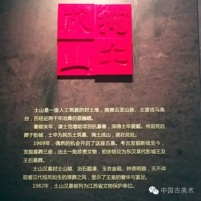 土山是座高大的封土堆,1969年附近群众取土烧砖,在山之东北隅发现一座墓葬,70年清理了该墓。该墓出土众多文物,其中较为重要的要属在1979年出土的一件完整的银缕玉衣。这件长1.7米,由2600多块玉片用银丝编缀而成。其复制品现存于博物馆馆天工汉玉展厅,具有较大的考古价值。土山位于徐州博物馆北侧。《魏书?地形志》、《水经注》及方志等记载土山为高冢戍、亚父冢、范增墓。传说范增助项羽推翻秦王朝,深得士卒爱戴,死后士卒为其负土筑墓,所以土山是“掬土成山”的简称。实际上土山是东汉某代彭城王的陵墓。
