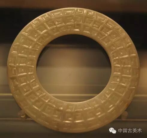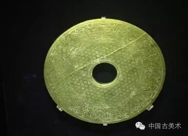 玉璧直径22.5厘米,青玉制成。璧面纹饰以同心圆绳纹分为内外两区,内区为涡纹,外区为四组变形夔龙纹。龙纹结构奇特,龙头雕出额头及鼻梁,嘴不明显,鼻下部两侧各有两条粗阴线,两个飘带状角向两侧延伸,将龙身缠绕。