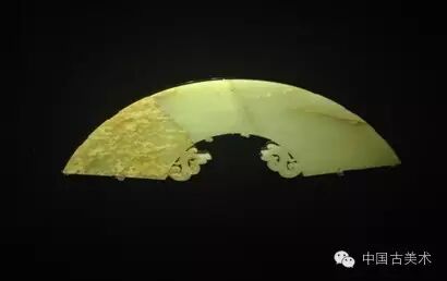 玉璜出土于甬道中,发现时碎成3块,已经粘合。该玉璜以名贵的和田玉琢成,质地坚硬,细腻温润。器身磨光,素面,外缘和两侧边皆有减缘形成的牙槽,内缘有连续的透雕纹样,可惜部分纹样已残失。从残余纹样造型看,原来雕琢的可能是龙凤纹。玉璜正中顶部钻有配挂用的小孔。该器是目前已知体量最大的玉璜,质量上乘,但给人以未完工的感觉,可能是一件半成品,璜体尚未及雕琢纹饰就随葬于楚王墓中。