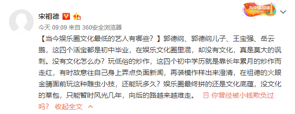 宋祖德发文称,郭麒麟、王宝强、郭德纲和岳云鹏都是初中毕业,在娱乐圈混却没有文化,简直是讽刺至极。同时还大骂四人是通过炒作而走红的,故意搞点负面新闻,再由自己来澄清,雕虫小技。最后还大骂郭德纲等人是“没文化的草包”,只能暂时风光几年,今后的路会不好走。对于宋祖德的大言不惭,众人实属佩服他的勇气,毕竟在娱乐圈中,没有几位敢开怼郭德纲的。就他所说,实在难以令人信服,也不记得郭德纲有何负面新闻。
