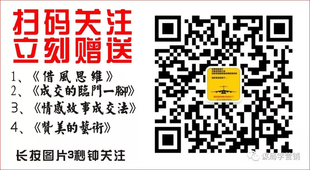 精彩的故事和干货那么多,你不关注,损失的又不是我!点击上面蓝色字体“谋局学营销”,再点击“关注”,这样您可以每天免费接收文章,刚关注的朋友可查看历史,阅读以往精彩文章。