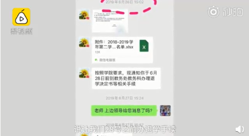 这位同学并没有理会这份公告。6月26日辅导员发微信给这位同学,告诉他6月28日办理退学手续。