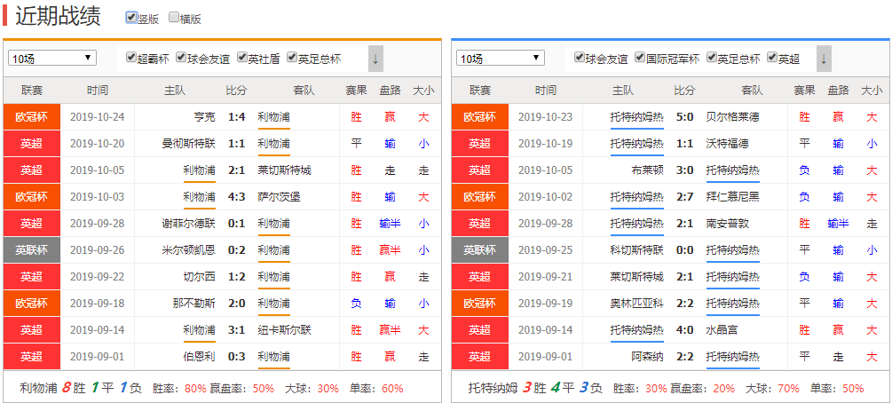 热刺:热刺本赛季表现令人失望,至今联赛录得3胜3平3负,跌出前六。其中客场更是未尝一胜,排名英超倒数第4位。上轮联赛主场对阵副班长沃特福德,白百合掌控7成球权但却未能在攻势上与对方拉开差距,直到第86分钟才取得进球,1-1艰难逼平对手。好在周中欧冠小组赛,热刺狠狠地出了一口恶气,主场5-0血洗贝尔格莱德红星,在本轮大战来临之前及时重振士气。热刺本赛季最大的问题就是防守不佳,之前在主场被拜仁打进7球,而本赛季6场正式比赛客场,除了联赛杯与英乙球队科切斯特联互交白卷外,其余每仗均丢2球。上赛季,热刺联赛被利物浦双杀,随后欧冠决赛也被对方2-0淘汰。历史交锋上,他们19次走访安菲尔德球场竟然只赢了一次,而且要追溯到2011年,往绩处于下风。加上两队本赛季表现形成强烈反差,此消彼长之下,本轮利物浦主场敲响胜鼓在望。